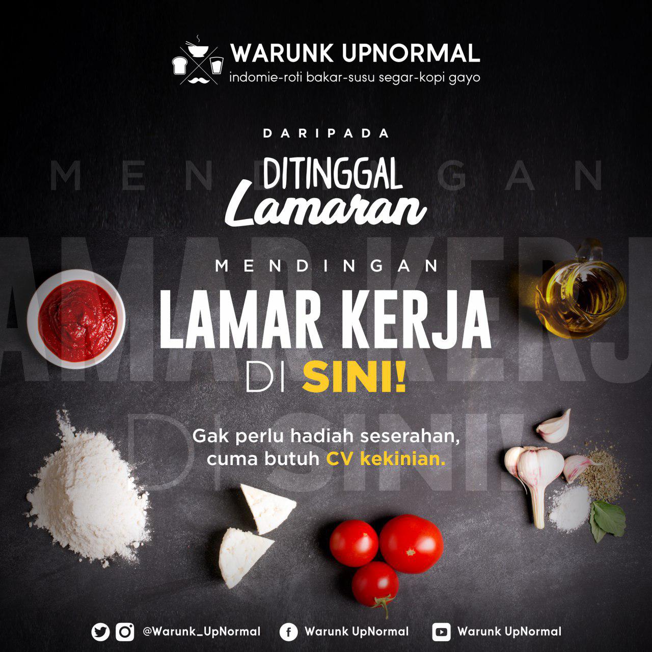 Hubungi perusahaan impianmu sekarang, dengan melamar online di jobs.id! Lamar sekarang lowongan kerja outlet manager di warunk upnormal malang 2021. "loker warunk upnormal ciledug : Silahkan datang langsung dengan membawa cv dan surat lamaran pada: Lowongan kerja warunk upnormal terbaru berita viral hari ini.